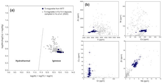 (a) Discriminant diagram of log(Al) + log(Ti) + log(V) vs. log(Mn)/[log(Co) + log(Mg)] for Ti-magnetite from MTT facies and compiled data of Fe-Ti-V deposits, adapted from [51]. (b) Trace elements (ppm) diagrams for Ti-magnetite from MTT facies. Ti-magnetite compiled data from worldwide Fe-Ti-V deposits are presented for comparison [51].