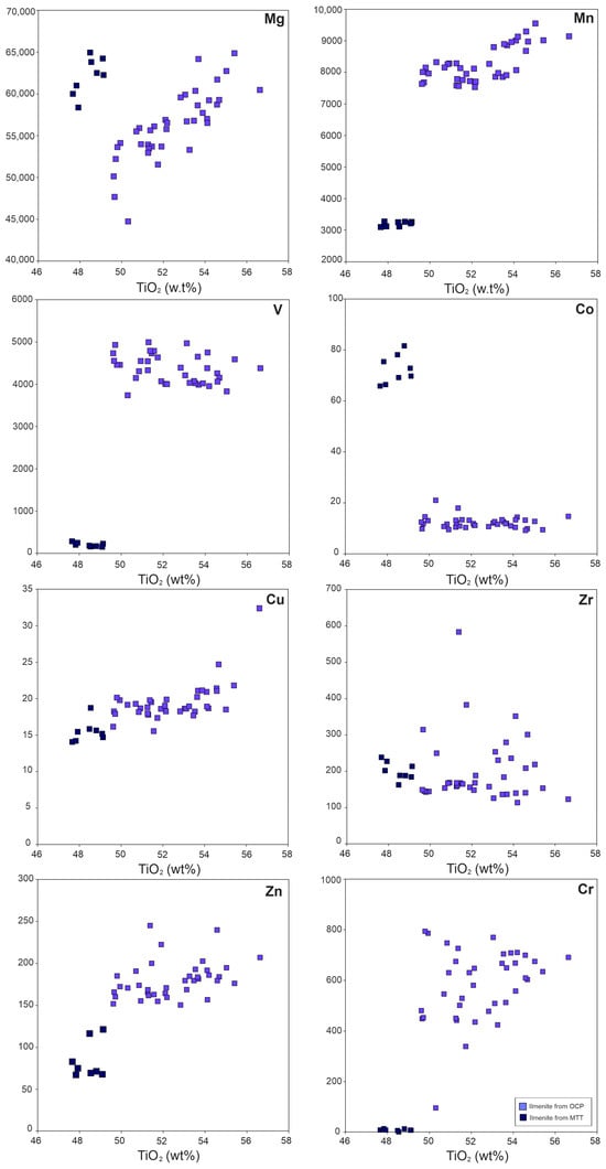 TiO2 (wt%) vs. Mg, Mn, V, Co, Cu, Zr, Zn and Cr (ppm) contents of ilmenites from the OCP and MTT facies.