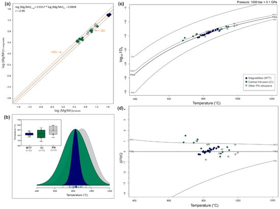 (a) Mg/Mn equilibrium test after [55] in magnetite–ilmenite pairs from PN. 2σ represents the standard deviation of the equilibrium line (in orange). (b) Kernel density estimation (KDE) and box plot diagrams for the obtained temperatures. Temperature estimation after [53]. (c) Temperature vs. oxygen fugacity of magnetite-ilmenite pairs from PN massif. (d) Temperature vs. ΔFMQ of magnetite-ilmenite pairs from PN massif. Oxygen fugacity estimation after [54]. Buffers were obtained in [56]. Abbreviations: MH—magnetite-hematite, NNO—nickel-nickel-oxide; FMQ—fayalite-magnetite-quartz; WM—wüstite-magnetite.