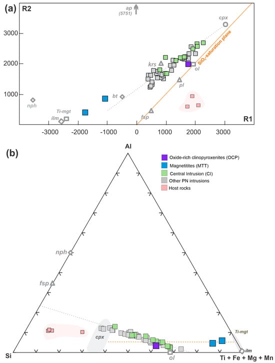 (a) R1-R2 diagram [57] for rocks from the PN massif and host rocks. Average mineral poles were compiled from [36] and are representative of the main assemblage found in PN (modified after [20]). (b) Al-Si-(Ti + Fe + Mg + Mn) ternary diagram for rocks from the PN massif and host rocks in molar proportions. Mineral chemistry data (in gray) for clinopyroxene and Fe-Ti oxides are from this work. Nepheline, feldspar and olivine compositions in the ternary are from their ideal formula. Abbreviations: cpx—clinopyroxene, Ti-mgt—Ti-magnetite, ol—olivine, ilm—ilmenite, nph—nepheline, fsp—alkali-feldspar, pl—plagioclase, ap—apatite, bt—biotite, krs—kaersutite.