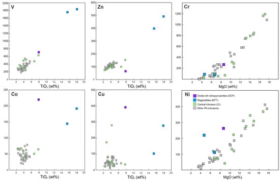 Bivariant diagrams of TiO2 (wt%) vs. V, Zn, Co and Cu (ppm) from the PN massif rocks, and MgO (wt%) vs. Cr and Ni (ppm) from the PN massif rocks.
