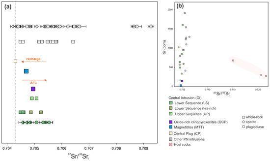 (a) 87Sr/86Sri of PN massif intrusions. Sr isotopes obtained in whole-rock, apatite and plagioclase analyses. (b) 87Sr/86Sri vs. Sr (ppm) from the PN massif rocks and host rocks. Compiled data from [20]. Abbreviations: AFC—assimilation + fractional crystallization.
