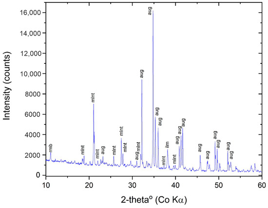 X-ray data are consistent with chemical and petrographical results. In the MTT samples (Table 2), Ti-magnetite is the predominant phase, which is accompanied by minor quantities of ilmenite, spinel and varying amounts of Ti-bearing augite. In addition, anatase and goethite were also identified. The OCP (Figure 15) sample exhibits a more complex mineralogical composition, dominated by Ti-augite (67 wt%), alongside small proportions of diopside, ilmenite and pyrite. The presence of melantherite (FeSO4·7H2O) in significant amounts and traces of rhomboclase ((H5O2)Fe(SO4)2·2H2O), both as alteration products of pyrite (Figure 2e–g), is noteworthy. Rietveld simulations used phases with chemical compositions similar to those observed in the samples. The refinement process accounted for sample height displacement, cell parameters, peak broadening, preferential orientation and thermal parameters. The substitution of Si in magnetite, up to 2.5 wt%, did not yield discernible shifts in its diffraction peaks.