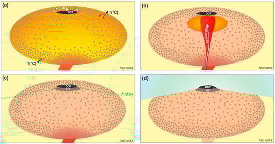 The proposed unified model (Figure 16), therefore, consists of the following stages: (1) establishment of the cumulate framework in the mush zone of PN’s upper walls, with consequent heat loss to its host rocks and eventual assimilation of partially melted crustal components; (2) Fe-Ti oxide supersaturation triggered by crustal assimilation, forming OCP; (3) subsequent to OCP, in the final stages of crystallization, a new episode of magma recharge forming MTT; (4) the eventual erosion of the uppermost sequences of PN, exposing the lithologies approached in this study.