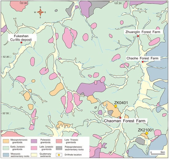 - Deng, C.Z.; Sun, D.Y.; Han, J.S.; Chen, H.Y.; Li, G.H.; Xiao, B.; Li, R.C.; Feng, Y.Z.; Li, C.L.; Lu, S. Late-stage southwards subduction of the Mongol-Okhotsk oceanic slab and implications for porphyry Cu-Mo mineralization: Constraints from igneous rocks associated with the Fukeshan deposit, NE China. Lithos 2019, 326–327, 341–357. [Google Scholar] [CrossRef]