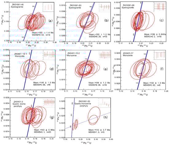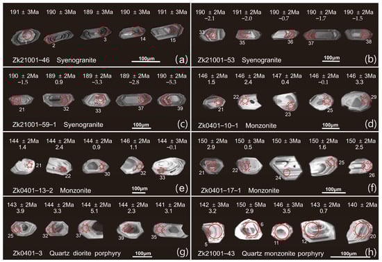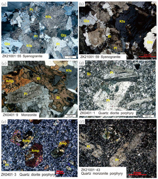 - Deng, C.Z.; Sun, D.Y.; Han, J.S.; Li, G.H.; Feng, Y.Z.; Xiao, B.; Li, R.C.; Shi, H.L.; Xu, G.Z.; Yang, D.G. Ages and petrogenesis of the Late Mesozoic igneous rocks associated with the Xiaokele porphyry Cu–Mo deposit, NE China and their geodynamic implications. Ore Geol. Rev. 2019, 107, 417–433. [Google Scholar] [CrossRef]