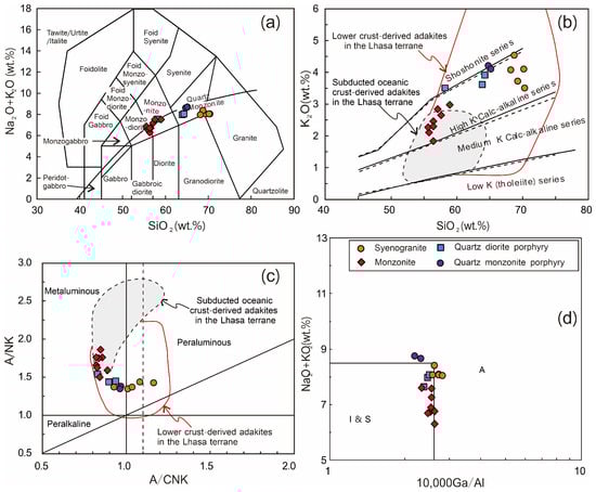 - Gou, J.; Sun, D.Y.; Ren, Y.S.; Hou, X.G.; Yang, D.G. Geochemical and Hf isotopic compositions of Late Triassic–Early Jurassic intrusions of the Erguna Block, Northeast China: Petrogenesis and tectonic implications. Int. Geol. Rev. 2017, 59, 347–367. [Google Scholar] [CrossRef]