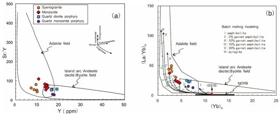 - Jiang, Y.H.; Jiang, S.Y.; Ling, H.F.; Dai, B.Z. Low-degree melting of a metasomatized lithospheric mantle for the origin of Cenozoic Yulong monzogranite-porphyry, east Tibet: Geochemical and Sr–Nd–Pb–Hf isotopic constraints. Earth Planet. Sci. Lett. 2006, 241, 617–633. [Google Scholar] [CrossRef]