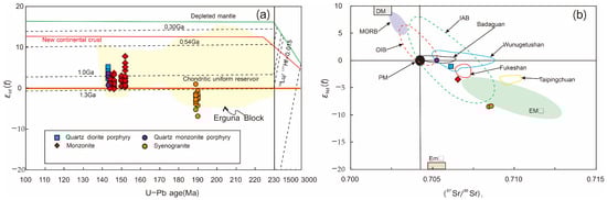 - Gou, J.; Sun, D.Y.; Hou, X.G.; Yang, D.G. Geochronology, geochemistry, and zircon Hf isotopes of the late permian–early Triassic Wuma intrusions in the Erguna Block, northeast China: Petrogenesis and implications for tectonic setting and crustal growth. Geol. J. 2018, 53, 1906–1920. [Google Scholar] [CrossRef]