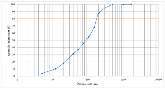 The tailing sample used in this study was a product of a flotation process generated in the pilot plant of the Oulu Mining School (University of Oulu, Finland). The ore precedence is from the Pyhäsalmi mine, with over 70% sulphur in pyrite, chalcopyrite, sphalerite, and pyrrhotite form. The average concentration of the principal elements is 1.2% Cu, 2.2% Zn, and 38.4% S [50]. A total of 285 kg of tailing sample was used to carry out the laboratory tests. The sample was dried for 48 h at 80 °C, homogenised using riffle splitters, and reduce to subsamples of 2500 g and 500 g for flume and settling tests, respectively, with additional reductions according to the solid percentage required in the experimental design. A total of 100 g of subsamples was used for density, particle-size distribution, and chemical characterisation. The particle-size distribution (PSD) analysis (Figure 3) revealed a P80 of 184 µm, with particles between 2 and 75 µm accounting for 46% and particles under 20 µm making up 18%. The tailing density was 3.34 g/mL, typical of a zinc–copper sulphide ore flotation. An XRF-based analysis showed a composition of 34.0% SO3, 20.8% Fe2O3, and 17.3% SiO2.