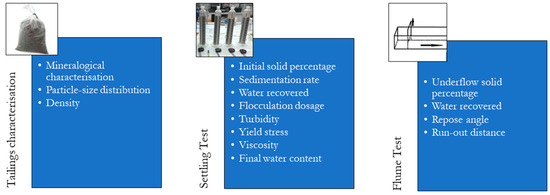 The mining industry has shown a growing interest in addressing challenges related to the processing of low-grade sulphide ores; evidently, the major amount is waste material or tailings needing adequate management and disposal. A wide range of challenges may arise in the domains of tailings operations (e.g., inefficient management), structures (e.g., dam failures, unstable slopes, and seepage), and the environment (e.g., ecosystem disruption, acid mine drainage) [1,2]. Another challenge involves reusing water; for instance, a concentrator plant processing 100,000 tonnes of ore per day generates tailings with a solid concentration of 55%, which results in a daily loss of approximately 81,800 m3 of water during the disposal of the tailings [3]. Tailings characteristics such as mineralogy, particle-size distribution, water content, compaction capacity, and viscoelasticity have a direct impact on the day-to-day functioning of tailings storage facilities (TSFs), starting with the thickening stage and their water recovery performance, all the way to the final disposal [4]. TSFs’ capacity and geotechnical performance can be directly affected by these factors and changes in geotechnical conditions, leading to the risk of failure [5,6]. Such factors, together with unplanned disposal schedules, might result in safety problems, shorten the intended lifespan of the facility and disrupt water balance control during operation [7,8], and reveal how an increase in clay concentration in the tailings directly affects drainage in the tailings deposit. All the above prompt us to examine tailings behaviour, particularly the flowability of tailings during disposal. The flowability generated during this process can directly impact the long-term stability of the deposit, ensuring its operational continuity and permeability characteristics necessary for water recovery. In order to develop a thorough comprehension of tailings behaviour, it is necessary to ascertain the direct impact of the factors present in the various phases of tailings disposal.