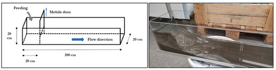 The second aspect of our investigation focused on dynamic changes in tailings drain flow through a flume test, using laboratory-scale acrylic equipment (200 cm long by 20 cm wide). We estimated the repose angle (qR) using Equation (5), based on measurements of the tailings heights (H1 and H2) and the length travelled by the material (L). In addition, the water recovered and final solid percentage were measured, using the methodologies presented by Clayton et al. [57], Kwak et al. [58], and Oliveira et al. [59]. Figure 6 offers a graphical representation of the experimental arrangement for the flume test.