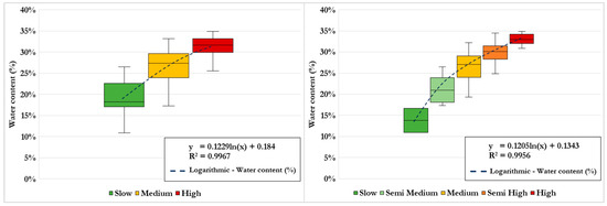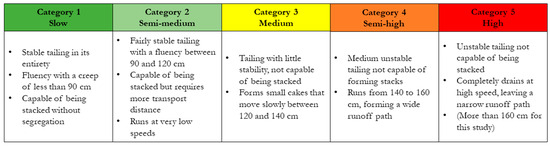As it was established by Pieretti et al. [70], water content is a critical variable influencing tailings behaviour during transport and deposition. Analysing the water content percentage against flowability as shown in Figure 17, there is a clear relationship, where the water content increases for both cases independent of the number of categories selected. This relationship follows a logarithmical trend for both three and five categories, with correlation coefficients of 99.67% and 99.56%, respectively.