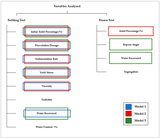 The groups of variables chosen for Model 1 correspond to the variables that have the greatest impact on the tailings flow generated at the time of being deposited, including both the thickening and discharge operation [58,61,62]. Model 2 uses variables that can be monitored directly from the operation [2,63], including characteristics that can be analysed with portable instruments such as yield stress and turbidity. Model 3 considers a mixture of data, comprise those obtained in operation with real-time monitoring [64,65] and laboratory tests.