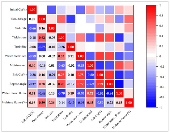 The correlation matrix analysis reveals the complex nature of tailings process operations. Figure 10 shows density graphs on the major diagonal, highlighting the correlations among the dataset variables. A significant variability among the parameters indicates the necessity for meticulous monitoring and control to achieve the desired outcomes. Notably, the flocculant dosage correlates positively with sedimentation rate, yield stress, and repose angle. The solid concentration (%) significantly impacts water recovery, turbidity, moisture content, sedimentation rate, and yield stress. The positive correlation between water balance in the settling and flume tests and the final tailings water content underscores the intricate interactions within the system. High coefficients of variation (CVs) for turbidity (120.50%) and yield stress (40.02%) emphasise the variability in these measurements, due to factors like solids percentage and settling rate.