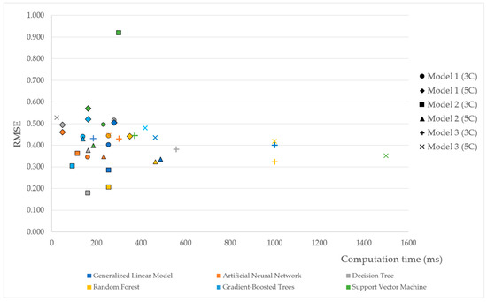From a comparison analysis of prediction model reliability performance and computation time (Figure 11), the ANN stands out in performance, showcasing 20% lower RMSE values compared to the other methods, indicating its superior predictive accuracy. In computation time, the ANN exhibits low scoring times, with an average reduction of around 50% compared to the other methods. This efficiency underscores the ANN’s practical feasibility for real-time applications. Decision trees, while offering simplicity, display a mixed performance, with noticeable disparities in RMSE values. Random forests and gradient-boosted trees have a varying performance, with random forests showing a relatively stable performance, albeit with slightly higher computational requirements compared to the ANN. Gradient-boosted trees exhibits competitive RMSE values but with significantly higher scoring times, particularly evident with a five flowability categories scenario. Support vector machines (SVMs) demonstrate relatively high RMSE values, coupled with moderate to high scoring times. Generalised linear models consistently demonstrate a low RMSE at the three or five flowability categories.