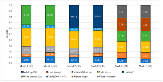 An analysis of the weights is conducted on the variable groups acquired from the tests (Figure 12), to determine the significance of the variables for the three variable groups (Figure 8) and examine their interactions. One important consideration is using a group of variables that are possible to measure at an industrial level (Model 2), and this type of method can be considered for obtaining data in the operational monitoring of tailings disposal. Based on the findings, the relative importance (weights) assigned to the input variables remains largely unchanged when the number of response categories is varied. For the predictive models, yield stress is a cross-sectional variable. For Models 1 and 2, variables like the amount of water in the tailings or the solid concentration at the thickenings exit are very important. This indicates that, from a sensitivity analysis perspective, these variables are both highly influential and critical to the accuracy and reliability of the model. Conversely, variables with lower weights and sensitivity, such as sedimentation rate and turbidity, were found to have a lesser impact on the model’s predictions. Model 3 presents variables with proportional weights between them, with the water recovered in the deposit from the tailings and the repose angle being the most relevant. These findings confirm that the key variables identified in the weights analysis are indeed the most significant contributors to the models’ performance.