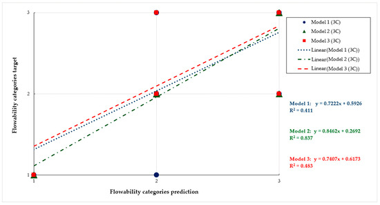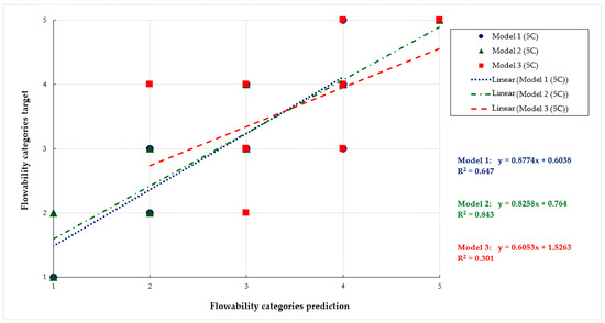 Increasing to five response categories (solid, semi-solid, intermediate semi-liquid, and liquid) as presented in Table 4, the model 3 accuracy decreased by 2.22%. However, it remains a model with a better classification capacity compared to models 1 and 2. This close classification is also present in the three models, creating a correctly solid flowability category for the cases. In the intermediate category, all three models performed reasonably well, with accuracy rates ranging from 81.08% to 90.00%. Model 2 had the highest accuracy of 90.00% among the three models, correctly classifying 36 out of 40 cases. It is important to consider that the decrease in the correct classification has a dependence on the number of cases available to generate the prediction and the incorporation of two new categories.