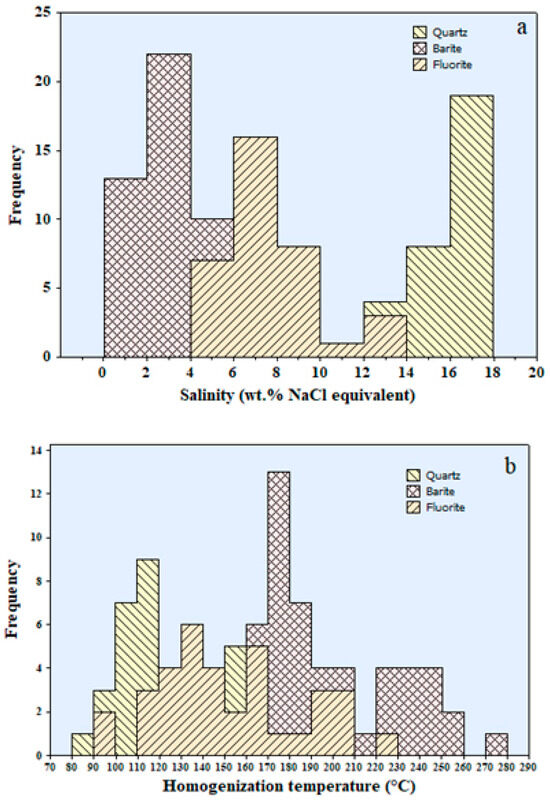 - Nejadhadad, M.; Taghipour, B.; Lentz, D.R. Implications of multiple fluids in the deposition of Pb-Zn-Ba deposits in the Alvand Mountain, Golpayegan, Iran: Evidence from fluid inclusions and O, C, S isotopes. Ore Geol. Rev. 2023, 153, 105300. [Google Scholar] [CrossRef]