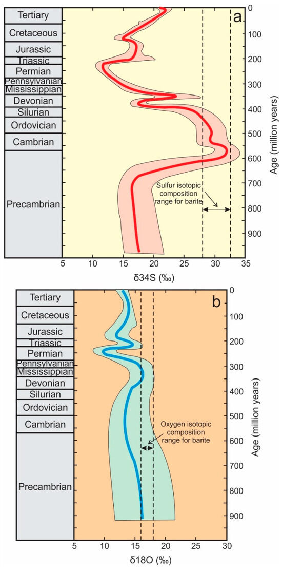 - Johnson, C.A.; Emsbo, P.; Poole, F.G.; Rye, R.O. Sulfur-and oxygen-isotopes in sediment-hosted stratiform barite deposits. Geochem. Cosmochim. Acta 2009, 73, 133–147. [Google Scholar] [CrossRef]