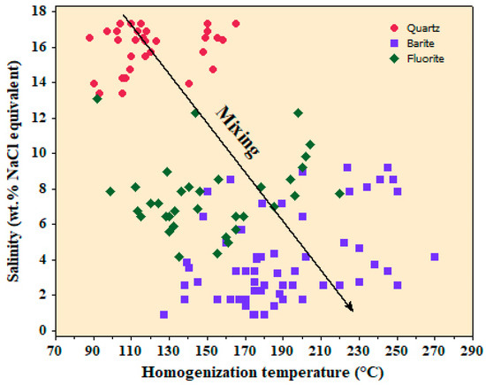 - Rajabzadeh, M.A. A fluid inclusion study of a large MVT barite–fluorite deposit: Komshecheh, Central Iran. Iran. J. Sci. Technol. Trans. 2007, 31, 73–87. [Google Scholar]
