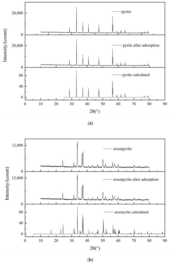 Pure mineral samples of pyrite and arsenopyrite were obtained from Yunnan Province, China, and crushed to a size of −0.0074 nm. Figure 1 shows the XRD patterns of pyrite and arsenopyrite before and after adsorption, as well as the XRD patterns obtained from the crystal structure calculations. As can be seen from Figure 1, the purity of pyrite and arsenopyrite is high, and the data align well with the calculated results. The ethylxanthate used in the experiments was acquired from Tieling Flotation Reagent Factory in China, and all the water used was deionized.