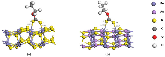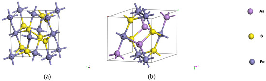 The equilibrium geometric structures of pyrite and arsenopyrite, calculated using DFT, are shown in Figure 2. Pyrite, with its cubic symmetry form and space group Pa3, and the cell parameter 5.417 Å [21], was used in our computations. For arsenopyrite, with triclinic symmetry, we used the crystal space group P-1 and the cell parameters a = 5.743 Å, b = 5.669 Å, and c = 5.787 Å [22]. The arsenopyrite (0 0 1) plane and pyrite (1 0 0) plane were determined as their most stable surfaces [23,24], leading to the creation of (2 × 2) supercells for each surface, separated by a vacuum of 15 Å, with only the top two atomic layers allowed to relax.