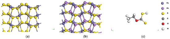Equilibrium geometries of the (a) pyrite (1 0 0) surface, (b) arsenopyrite (0 0 1) surface, and (c) ethylxanthate.