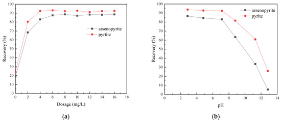 Effects of different reagent dosages at (a) pH = 7.12, CMIBC = 2 mg/L and (b) pH CMIBC = 2 mg/L, Ccollcetor = 4 mg/L on the flotation recovery of arsenopyrite and pyrite.