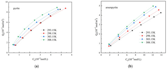 Figure 5 clearly shows that as the adsorption temperature increases, the ability of ethylxanthate to bind to the surfaces of pyrite and arsenopyrite also increases significantly. This indicates that ethylxanthate adsorption on pyrite and arsenopyrite surfaces is endothermic. The thermodynamic parameters of ethylxanthate adsorption on pyrite and arsenopyrite were determined by fitting the isothermal adsorption data using the Langmuir and Van’t Hoff equations [26,27].