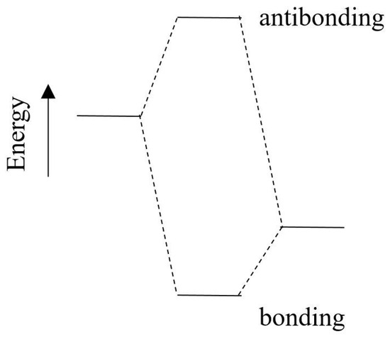 Since the adsorption of ethylxanthate on the surfaces of pyrite and arsenopyrite is chemical, it can be analyzed using molecular orbital theory. As shown in Figure 7, bond orbitals and antibond orbitals are formed after adsorption. Stable chemical bonds can be created when only the bonding orbitals are occupied. Conversely, stable chemical bonds cannot form if both the bonding and antibonding orbitals are occupied.