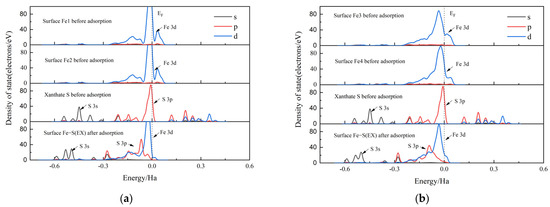 Figure 9a shows the PDOS of the Fe atoms on the pyrite surface before and after ethylxanthate adsorption. Since the Fe atoms on the pyrite surface are all in a five-coordinate structure and have consistent chemical properties, only the PDOS of one Fe atom before and after adsorption is presented. When ethylxanthate is adsorbed on the surface of pyrite, the interaction between the 3p orbit of S and the 3d orbit of Fe in the ethylxanthate is also mainly in the range of 0.2 to 0 Ha.