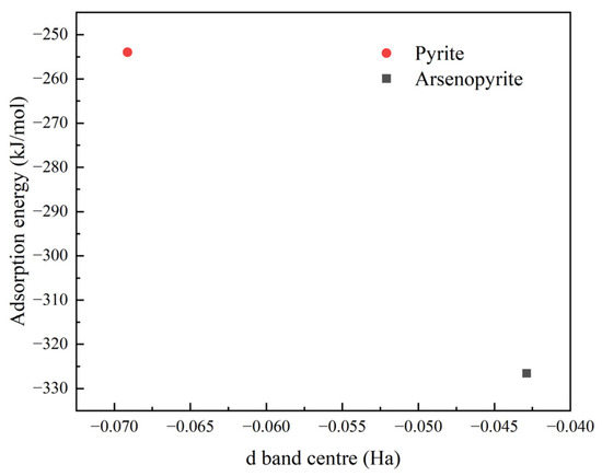 Further investigation using the d-band center (DBC) theory indicates that the adsorption capacity of Fe on pyrite surfaces is greater than that on arsenopyrite because the DBC of the Fe atoms on pyrite is closer to the Fermi level. This study demonstrates that ethylxanthate adsorbs more readily on pyrite surfaces. Therefore, in flotation process design, floating pyrite while depressing arsenopyrite flotation proves to be a more advantageous approach.