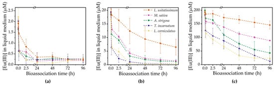 Almost quantitative bioassociation was achieved in the 20 µM flasks after 24 h for L. corniculatus, after 48 h for T. incarnatum, and after 96 h for A. strigosa and M. sativa as well. In the case of L. usitatissimum, 7 ± 3 µM Eu(III) still remained in solution after 96 h. 200 µM Eu(III), however, were not entirely removed from the medium, irrespective of the type of plant. Differences in the extent of Eu(III) removal by these were particularly evident in the high concentration approaches. L. usitatissimum removed the least Eu(III) from the solution, leaving 146 ± 15 µM in the flask, whereas L. corniculatus and T. incarnatum removed the most, leaving only 23 ± 16 µM and 13 ± 8 µM Eu(III) in the flask, respectively.