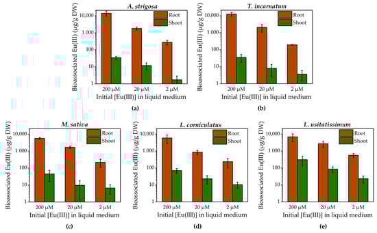 For lower concentrations and in the case of L. corniculatus, Eu(III) was either equally distributed between stem and leaves or accumulated more in the leaves. When comparing the amount of bioassociated Eu(III) in aboveground tissue, L. usitatissimum accumulated the most Eu(III), irrespective of the initial concentration, in numbers 309 ± 174, 86 ± 32 and 24 ± 10 µgEu/gDW at 200, 20 and 2 µM Eu(III) initial concentration. When only roots are considered, L. usitatissimum accumulated the most Eu(III) at 20 and 2 µM initial Eu(III) concentration (3183 ± 1219 and 563 ± 145 µgEu/gDW, respectively) and in the 200 µM approach A. strigosa (14,243 ± 4659 µgEu/gDW) and T. incarnatum (12,345 ± 2810 µgEu/gDW) showed the highest Eu(III) bioassociation.