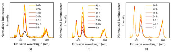 A comparable alteration in the Eu(III) luminescence spectra was observed over time in the liquid medium across various types of plants, as can be seen in