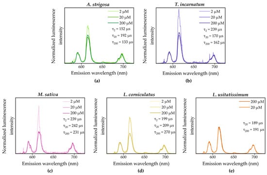 In order to obtain not only a quantitative but also a qualitative insight into Eu(III) bioassociation, plant parts exposed to various Eu(III) concentrations were analyzed by laser spectroscopy at the end of the experiment (96 h). The luminescence spectra of the roots of each plant are visualized in