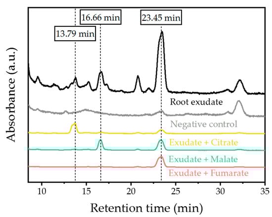 23]. Irrespective of the sampling method, the liquids were filtered through a 0.22 µm syringe filter and immediately analyzed by HPLC or stored at −20 °C until measurement. A negative control sample consisted of pure MilliQ filtered through a 0.22 µm syringe filter. Standards of fumaric, citric and malic acid were prepared as 10 mM stock solutions in MilliQ water and root exudate samples were spiked in such a way that final concentrations of 10, 250 and 250 µM, respectively, were obtained. Chromatography was performed on an HPLC system (1200 series, Agilent Technologies, Santa Clara, CA, USA) equipped with a sulphonated polystyrol/divinylbenzol resin column (Nucleogel ION 300 OA, MachereyNagel, Düren, Germany) and a diode array detector. The column was kept at 70 °C and the flow rate of 5 mM H