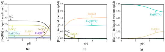 Figure 3). Therefore, another thermodynamic modelling of Eu(III) speciation in the liquid medium after 96 h was set up. Based on experience, concentrations of fumaric, citric and malic acid were assumed to be 0.4, 4 and 40 µM and final Eu(III) concentrations of 0.25, 2.5 and 50 µM were derived from data shown in