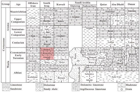 - Aqrawi, A.A.M.; Thehni, G.A.; Sherwani, G.H.; Kareem, B.M.A. Mid-Cretaceous rudist-bearing carbonates of the Mishrif Formation: An important reservoir sequence in the Mesopotamian Basin, Iraq. J. Pet. Geol. 1998, 21, 57–82. [Google Scholar] [CrossRef]