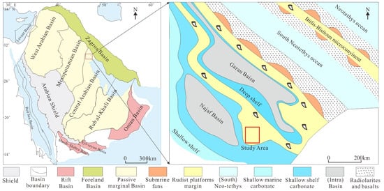 In the Cenomanian–Early Turonian, the Northern Central Arabian Basin was in a unique carbonate depositional environment. During the Early Cretaceous, the Arabian Plate moved toward the tropics and subtropics, and the Neotethys Ocean continued to rift, forming the Southern Neotethys Ocean at the northern and eastern margins of the Arabian Plate due to mantle subduction during extensional periods []. The opening of the Southern Neotethys Ocean led to the cessation of evaporite deposition in the Jurassic Gotina Basin, which has since converted to the Balambo-Garau Basin in the Cretaceous [,]. By the Middle Cretaceous, the Neotethys Ocean reached its maximum in rifting []. Meanwhile, the Amara uplift was formed by the Hormuz salt diapirism and the reactive of block faults in the Precambrian []. In Cenomanian, differential subsidence formed the Najaf Basin in central Iraq, and from the Amara uplift to the Najaf Basin, a broad, shallow-water carbonate ramp was formed []. The Najaf Basin filled with fine-grained organic-rich sediments and was rimmed by shallow-marine carbonate sediments that prograded into the basin []. The depositional system was typically described as a shallow, rudist buildup-rimmed carbonate platform, fringing the organic-rich sediments of the intrashelf basin [] (Figure 2). By the Late Cretaceous, this passive margin changed to a convergent margin after north-easterly subduction of Neo-Tethyan oceanic lithosphere [].