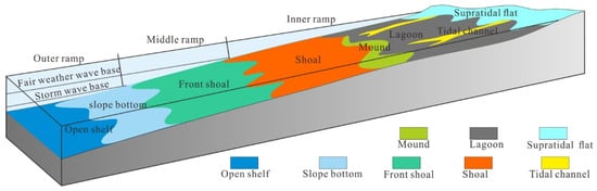 The Northern Central Arabian Basin in Cenomanian–Early Turonian was deposited in a shallow carbonate ramp, and developed supratidal flats, lagoons, tidal channels, mounds, shoals, front shoals, a slope bottom, and an open shelf [] (Figure 3). During the Cenomanian–Early Turonian, the water was shallow and sensitive to changes in sea level, resulting in frequent changes in diagenetic environment. The depositional hydrodynamics of the shoal, mound, and tidal channel are strong. The depositional hydrodynamics of the front shoal and the slope bottom are moderate, and the depositional hydrodynamics of the lagoon, the open shelf, and the supratidal flat are weak. Diagenesis can differentiate the reservoirs physical properties in the same facies as well as converge the reservoirs physical properties in different facies.