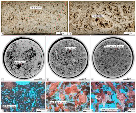 Penecontemporaneous dissolution of the Cenomanian–Early Turonian is characterized by a large number of pores visible to the naked eyes. On the core, a large number of vug pores created via dissolution could be seen. The core is honeycombed, with pore sizes varying up to the centimeter (Figure 7a,b). On the CT, the pores are black in color, different from the bioclastics. The pores are mainly between 1 mm and 5 mm and are poorly sorted (Figure 7c,d), while some well sorted grainstone have pores less than 1 mm (Figure 7e). On the cast thin sections, Algae and Bivalve wackstone has been completely dissolved forming a large number of moldic pores where the Algae and Bivalves can only be judged by pore outlines (Figure 7f). Bivalves, Rudist, or Benthic Foraminifera in grainstone are dissolved, and the volume of interparticle pores increases dramatically, with significantly better connectivity (Figure 7g,h).