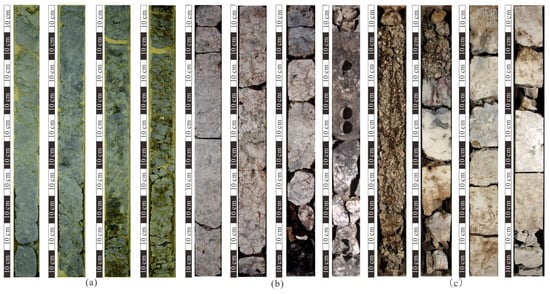 Karstification in Cenomanian–early Turonian. (a) B oilfield, B-1 well, core, white light, breccia; (b) A oilfield, A-1 well, core, white light, breccia; and (c) C oilfield, C-1 well, core, white light, breccia.