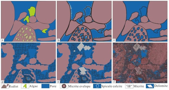 Micritization is prevalent in Cenomanian–Early Turonian carbonate rock. Micritization originates from microborings that are the penetration traces in hard substrates produced by microorganisms which represent mainly Algae, Bacteria, and Fungi []. While micritization can destroy bioclastic fabric, it can also serve to preserve bioclastic contour even though the bioclastic have been completely dissolved. As mentioned earlier, micritization is known as degrading recrystallization. Based on cast thin section, the mechanism of micritization is clarified by establishing a diagenetic model. In high-energy depositional environments, the sediments contain bioclastic such as Rudists and Algae, and the bioclastic is clean and free of micrite, and interparticle pores are developed (Figure 10a). In marine environments, micritization occurs in the biologic shells, forming the micrite envelope. Some organic matter of Rudist was decayed, forming of skeletal pores. Algae were completely dissolved, and only the residual micrite envelope retained the outline. Cementation occurs in marine environments and fibrous calcite encrusts on the outer edge of bioclast or inner edge of the pores (Figure 10b). Meteoric environments are characterized by intense dissolution. Fibrous calcite formed in the marine environments is mostly aragonitic or high-magnesium, which was dissolved during meteoric environments. The micrite envelope was also dissolved and became loose (Figure 10c). As the dissolution continued, the micrite envelopes completely lost their original fabric and the micrite were scattered in the pores. The pore volume was then decreased and some pore throats were partially blocked. The Rudist shell lost the protection of the micrite envelope, and were dissolved to some extent (Figure 10d). Algae lost their micrite envelope and only the pore outlines remained. In burial environments, compaction has less of an effect on Rudist fragments due to its hardness. With increasing burial depth, temperature and pressure favored dolomitization and few Rudist fragments were replaced by dolomite (Figure 10e). Finally, it formed its current appearance in the cast thin sections (Figure 10f).
