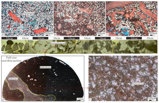 The organic matter in burrow III provides material for reducing bacteria. Reducing bacteria can remove SO42− that bind Mg2+ and increase the relative content of Mg2+. Moreover, ammonia in organic matter can reflect with H2O to form an alkaline environment, which promotes dolomitization []. Burial environments with exotic Mg2+ through fractures can also promote dolomitization. When sufficient dolomitization had occurred, burrow III was filled with euhedral dolomite with some intercrystal pores (Figure 12f). The actual cast thin sections are shown in Figure 12i.