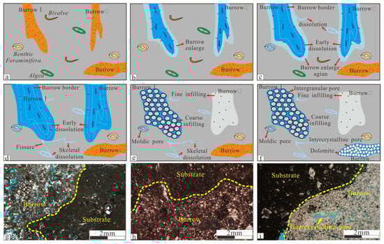 It should be noted that dolomitization does not occur in all burrows. The paper established a comprehensive diagenetic model in burrows. The sediment deposited in the low energy environment is characterized by lime mud, and it is easier to burrow through before compaction. The burrows are usually filled with organic matter produced by biological metabolism (Figure 12a). Burrow I and burrow II are in contact with the depositional interface, whose infillings are usually dissolved and the burrow will enlarge, while burrow III is detached from the depositional interface, and whose organic filling is preserved (Figure 12b). If there is sufficient diagenetic fluid, burrow I and burrow II will continue to be dissolved and enlarged. The substrate permeability around the burrow will increase, and the bioclastic near the burrows would be dissolved to form moldic pore (Figure 12c). Meanwhile, the continuous dissolution makes the substrate loose or even forms fractures, which can act as channel of diagenetic fluid (Figure 12d). The dissolved burrows would not remain empty but would be filled with sediments again after, such as coarse infillings in burrow I and fine infillings in burrow II (Figure 12e). The actual cast thin sections are shown in Figure 12g,h. The coarseness of the infillings is mainly controlled by depositional hydrodynamics. During the burial process, burrow I and burrow II would undergone conventional diagenesis while burrow III would have a different process.