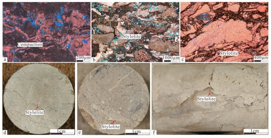 Compaction and pressolution in Cenomanian–early Turonian. (a) C oilfield, C-3 well, cast thin section, single polarized light, dyed, compaction; (b) D oilfield, D-1 well, cast thin section, single polarized light, dyed, compaction and pressure solution; (c) C oilfield, C-2 well, cast thin section, single polarized light, dyed, compaction and pressure solution; (d) C oilfield, C-4 well, core, white light, stylolite; (e) C oilfield, C-2 well, core, white light, stylolite; and (f) C oilfield, C-1 well, core, white light, stylolite.