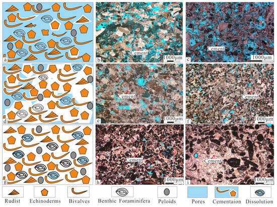 The first one is intense dissolution and rare cementation (Figure 14a), whose cement content is less than 30% of the pore volume. Dissolution dominates the reservoir microstructure. The reservoir is dominated by interparticle pores, vug pores, and few moldic pores; the pores are well connected (Figure 14b,c). The second one is medium dissolution and medium cementation (Figure 14d), whose cement contents range between 30% and 50% of the pore volume. Some pores are filled with calcite and some are retained. The pore throat was severely blocked and the pores were usually isolated from each other (Figure 14e,f). The last one is rare dissolution and intense cementation (Figure 14g), whose cement content is greater than 70% of the pore volume. Cementation dominates the reservoir microstructure. The pores are almost entirely filled with calcite, with a small amount of isolated pore remaining (Figure 14h,i).