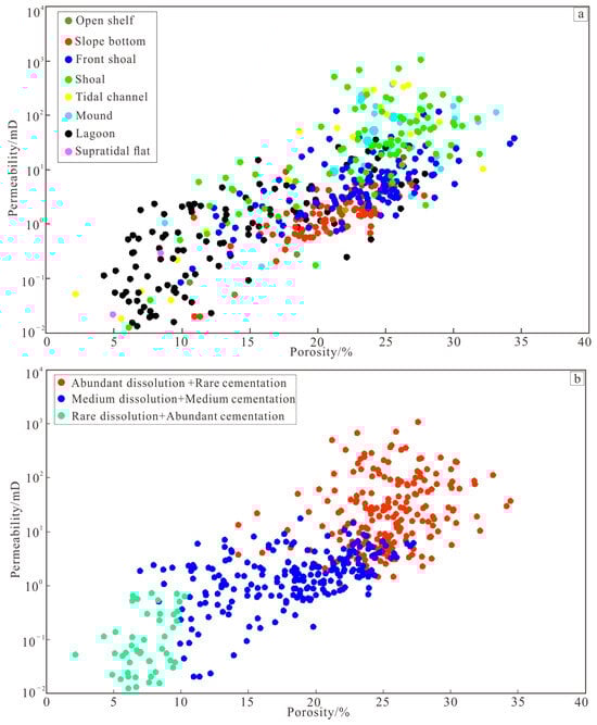 Eight depositional facies in the Cenomanian–Early Turonian developed, which are supratidal flat, lagoon, tidal channels, mound, shoal, front shoal, slope bottom, and open shelf. Different depositional facies have different physical properties, but the degree of physical property superposition of different depositional facies is severe (Figure 15a). There are fewer data on open land sheds and supratidal flats, and their physical properties are relatively concentrated. The physical properties of other high energy facies such as shoal, tidal channel, and mound, are overall dominated by medium–high porosity and medium–high permeability, however, these facies also develop some poor reservoirs with low porosity and low permeability. Depositional facies such as front shoal, lagoon, and slope bottom all span large physical property intervals. Overall, sedimentation has limited control over reservoir physical properties. Different diageneses of the same depositional facies can result in differentiation of physical properties, while the physical properties of different depositional facies can converge after diagenesis.